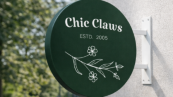 A circular projecting blade sign with a deep forest-green finish and delicate white botanical line art creates an elegant, boutique-style storefront presence. The sign features refined serif lettering with “Chic Claws”, complemented by a minimalist floral illustration that adds a soft, stylish touch. Mounted on a clean white bracket and extending outward from the wall, the design remains clearly visible to pedestrians while conveying a calm, upscale aesthetic suited for beauty salons, nail studios, and modern boutique businesses.